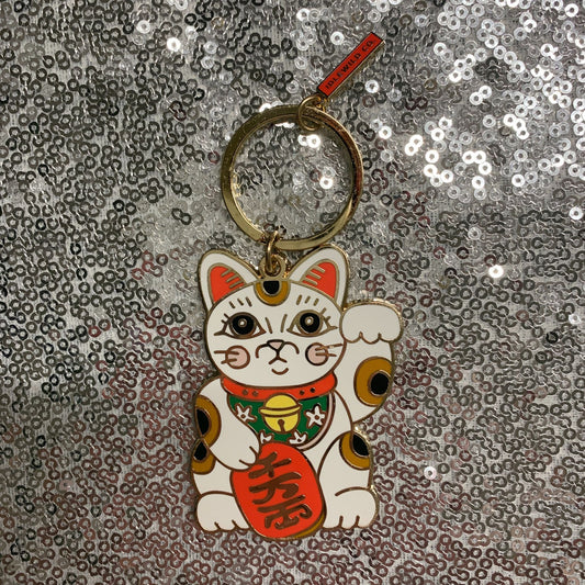Maneki Neko Cute Cat Brass and Enamel Keychain | Good Luck Charm Key Ring Holder