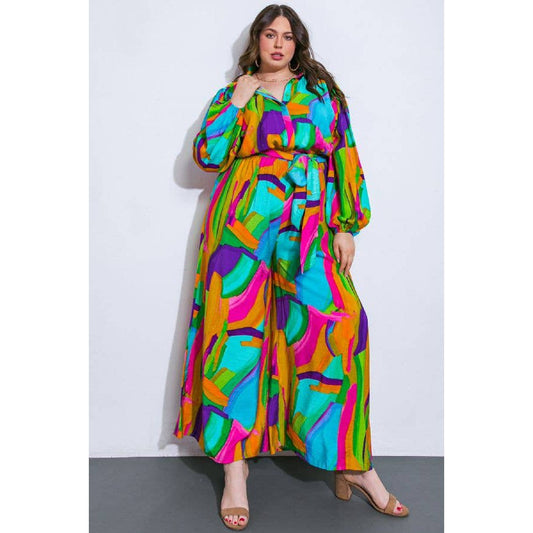 Plus Size Watercolor Printed Woven Jumpsuit | Green Pink Long Sleeve Overall Romper [Sizes 1X-3X]