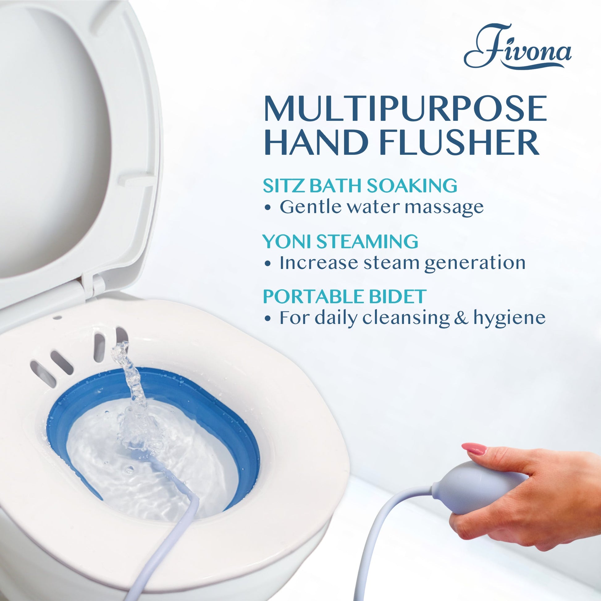Fivona 3 in 1 bundle includes 1 Hand Flusher which enhances soaking experience by providing massaging sensation. Also includes 1 expandable sitz bath seat and 1 high-quality storage bag.