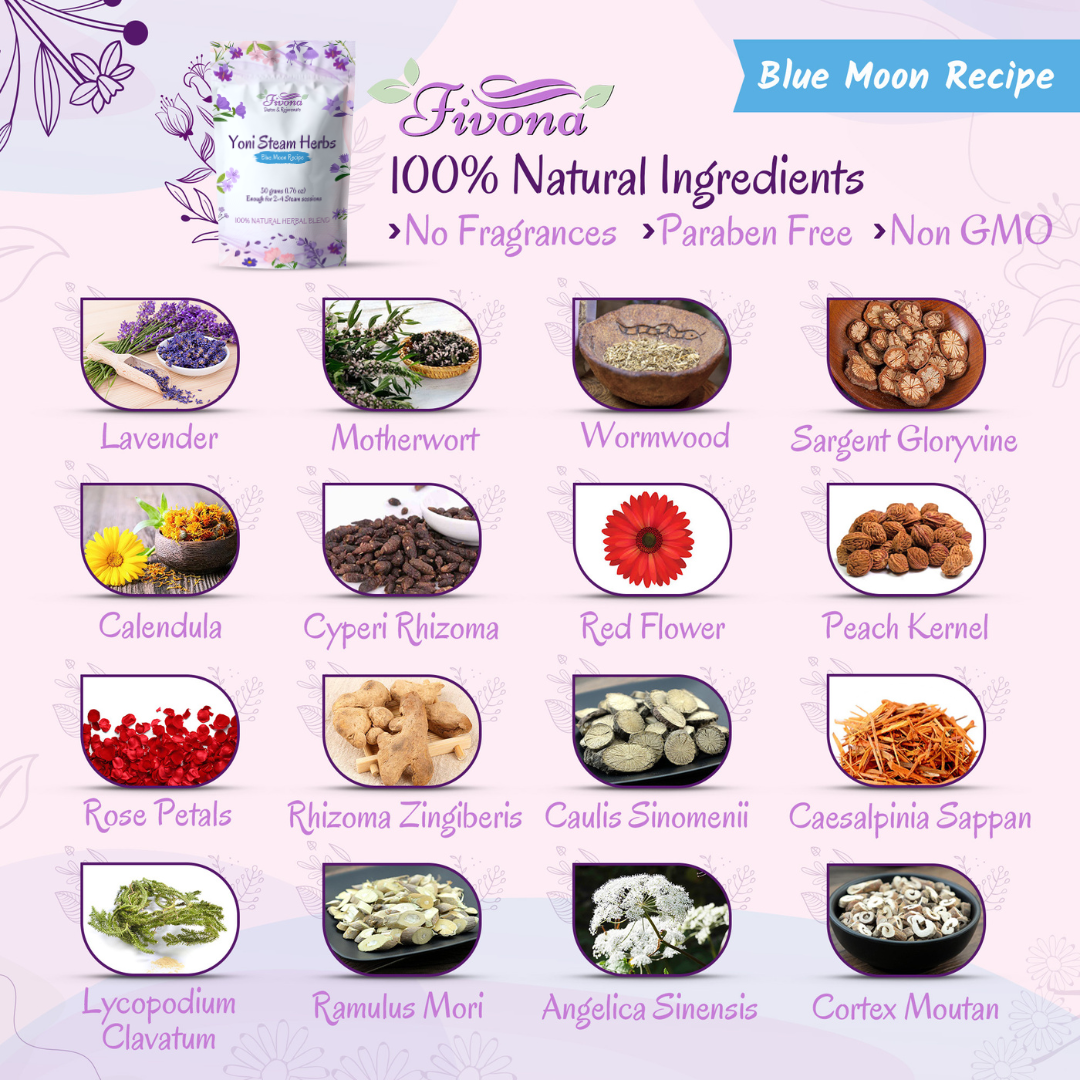 š Blue Moon Recipe V-steam Herb is made with 100% Natural 16 professionally blended herbs. These herbs have different benefits that provide support for women's well-being.