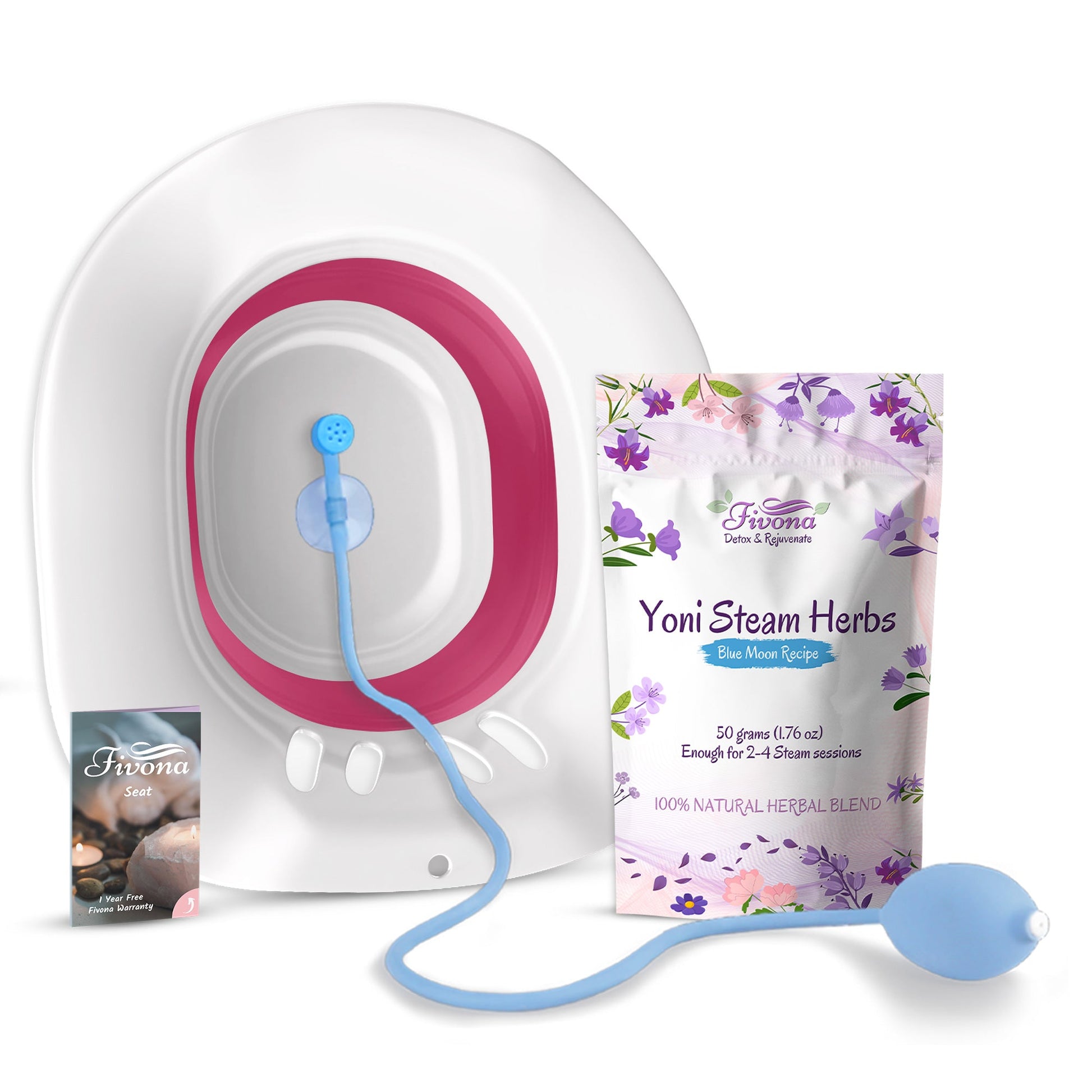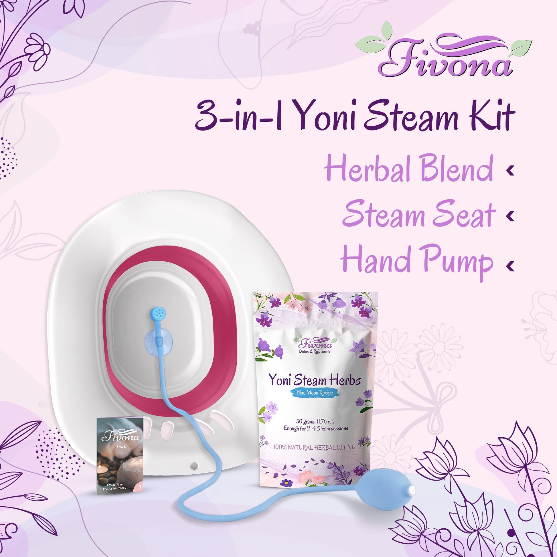 Fivona 3 in 1 Yoni Steam Kit Bundle includes 1 Fivona Expandable Yoni Steam Seat, 1 Hand flusher, and 1 pouch of Fivona All-natural Blue Moon Recipe Yoni Steam Herbs 1.76 oz which is good for 2 - 4 Steaming sessions.