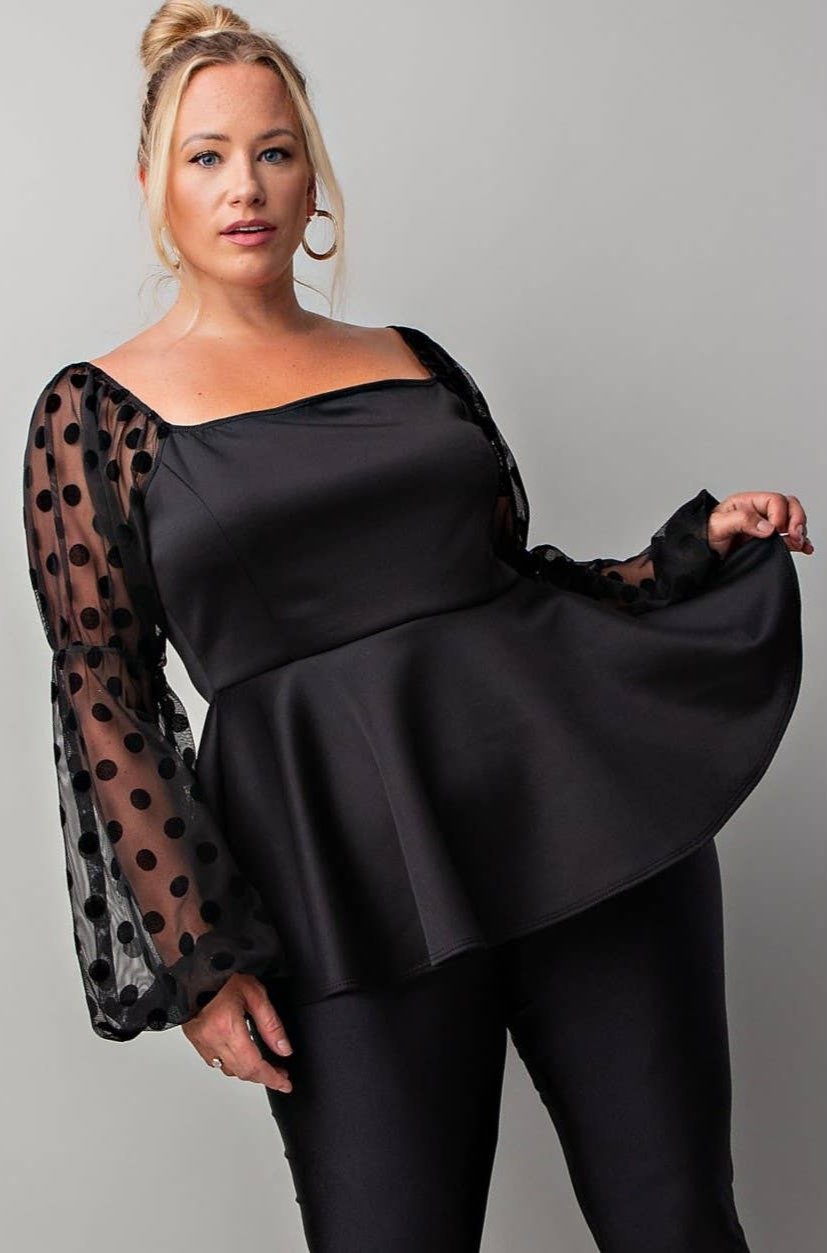 This stunning plus size peplum top features a chic square-cut neckline that beautifully frames your face. The long balloon sleeves with contrasting mesh dot accents add a touch of flair, making this top stand out in any crowd. The elasticized waist enhances your silhouette, allowing for a flattering fit that accentuates your curves while providing comfort.