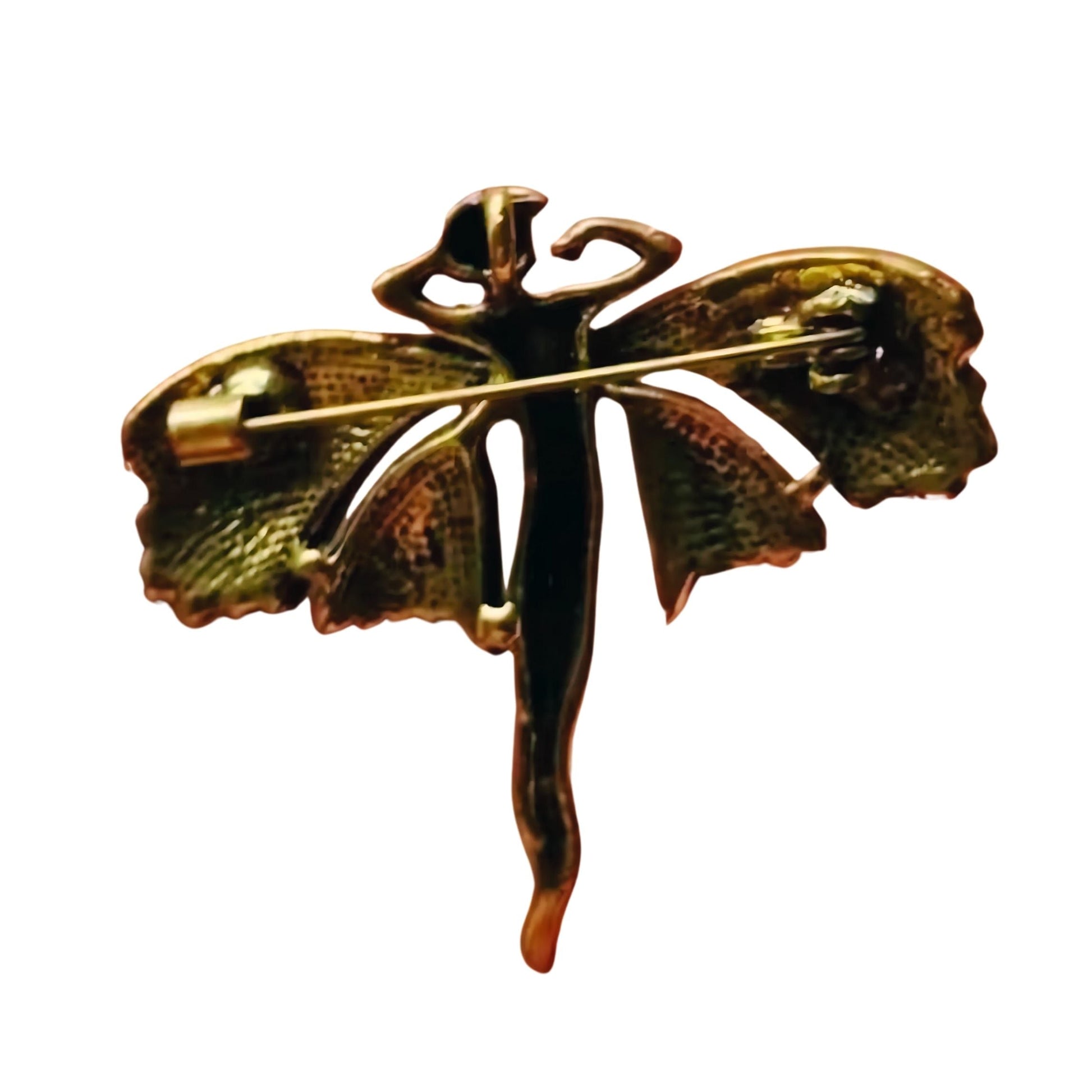 This brooch features a stunning Art Nouveau-style fairy, her wings outstretched in a poised, elegant dance. Cast in a warm antique gold-tone metal, the figure is framed by butterfly-like wings in swirling shades of blue, green, and ivory enamel. Each wing is adorned with sparkling rhinestones that catch the light like morning dew.