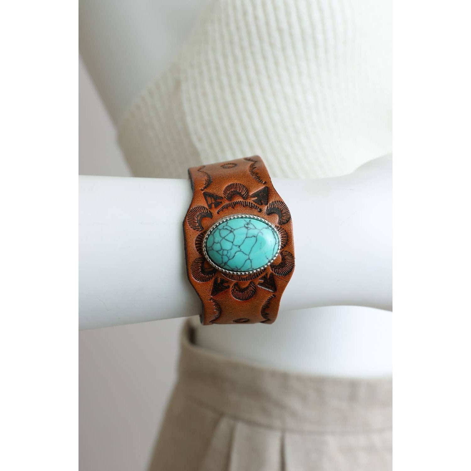 Boho Turquoise Stone Camel Leather Cuff Bracelet | 100% Leather Western Vibe