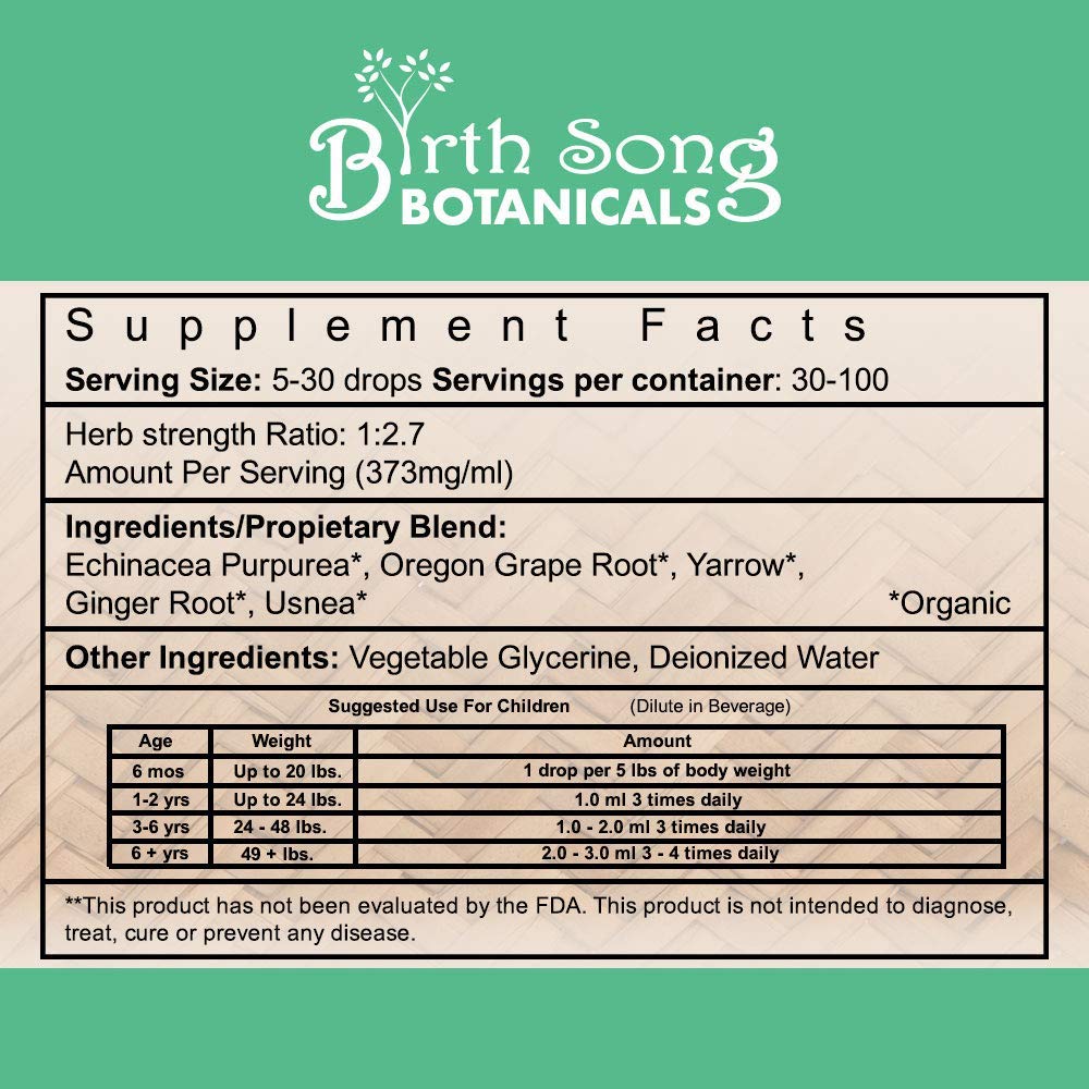 Ingredients: Organic Echinacea Purpurea, Organic Ginger Root, Organic Oregon Grape Root, Organic Yarrow, Organic Usnea, Vegetable Glycerin, and Deionized Water.