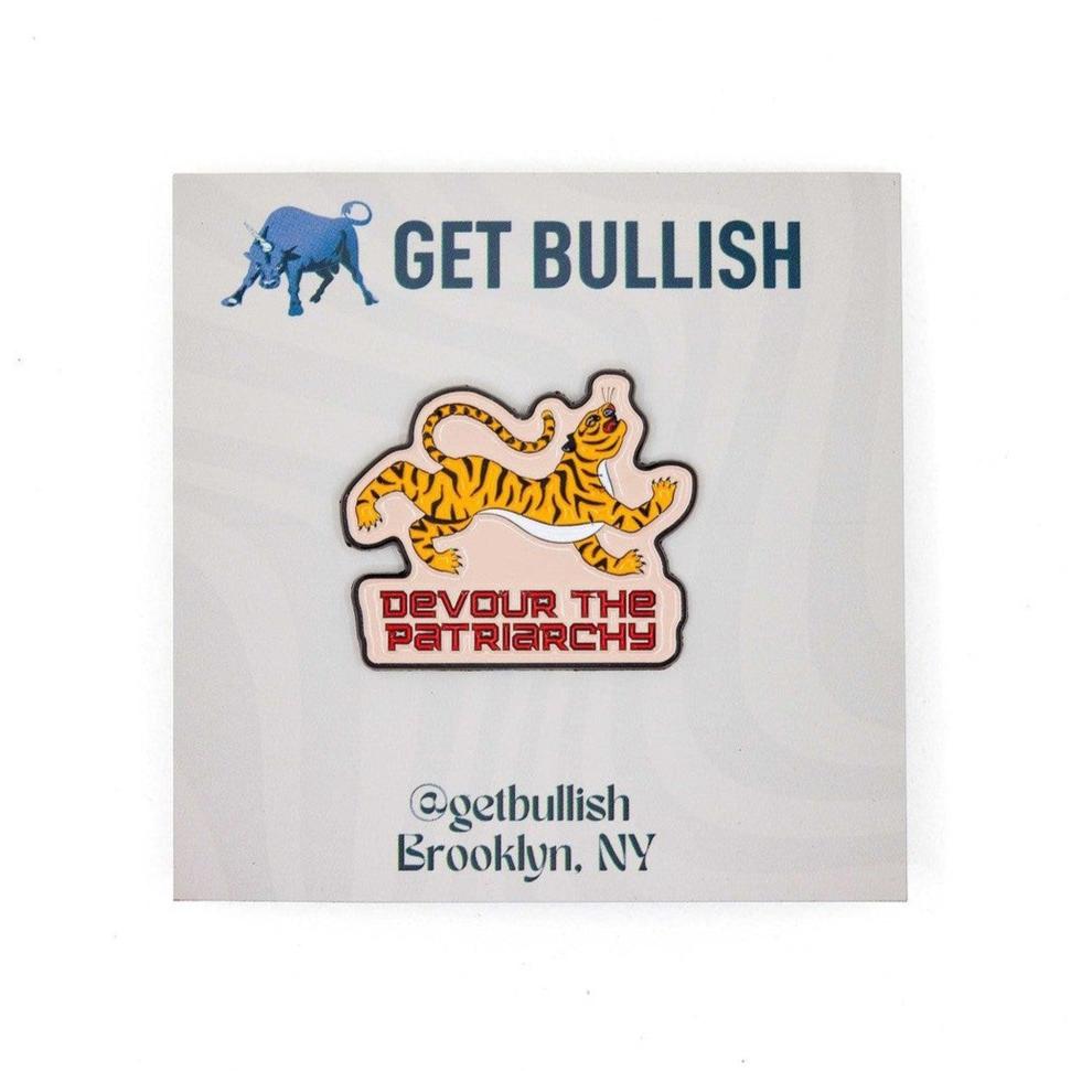 Soft enamel pin features a tiger motif and the text "DEVOUR THE PATRIARCHY"