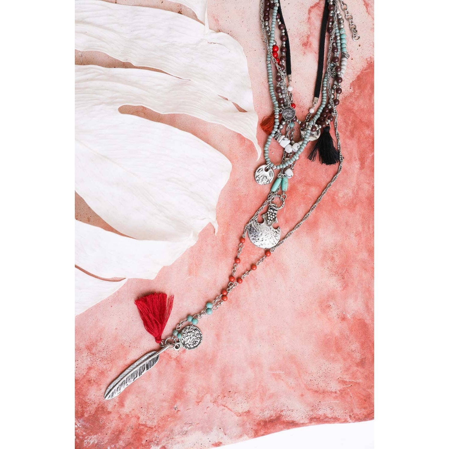 Go ahead, express your individuality with the Feather Fringe Multi-Layered Necklace!