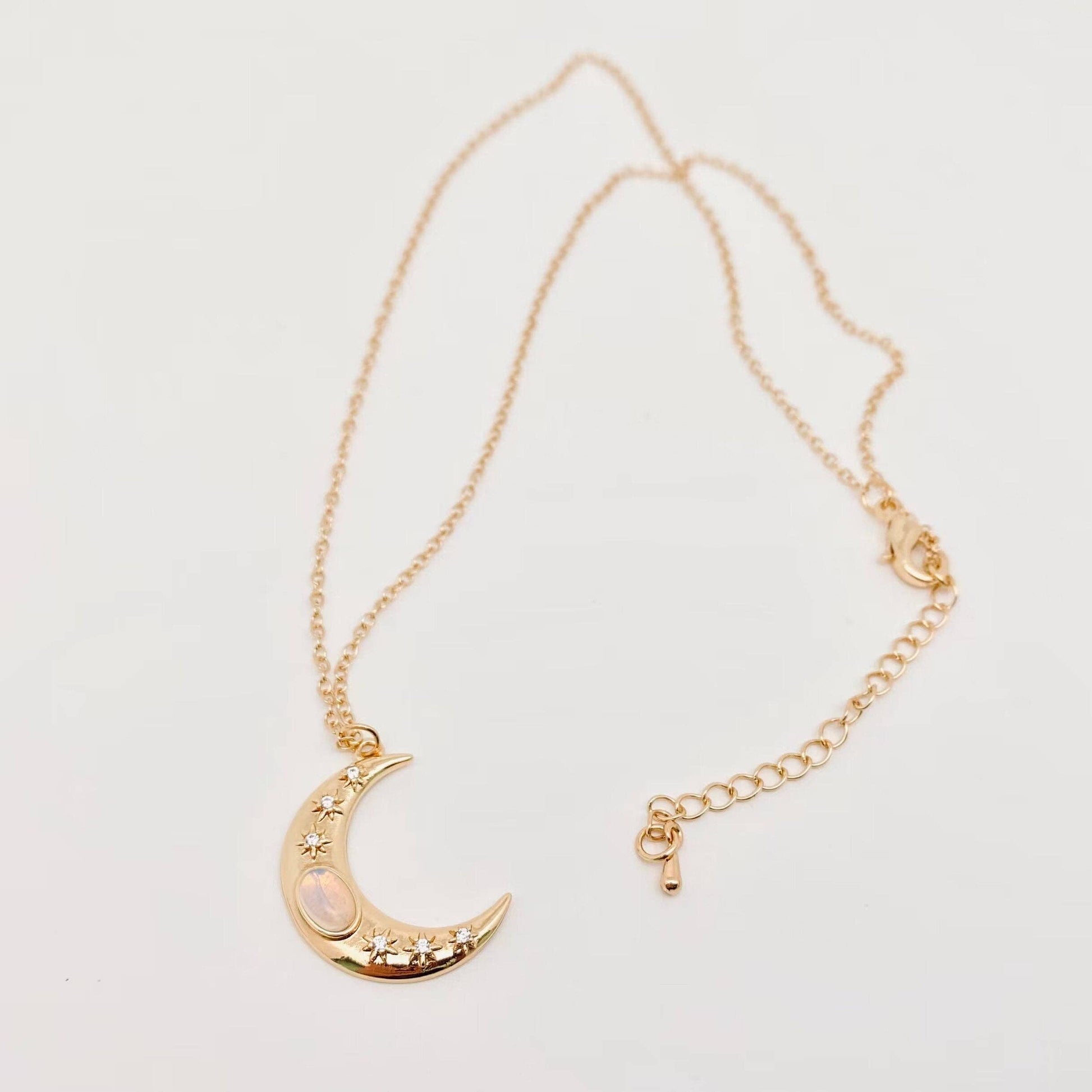 Golden Star Moon Inlaid Opal Pendant Necklace | Fashion Chain Jewelry