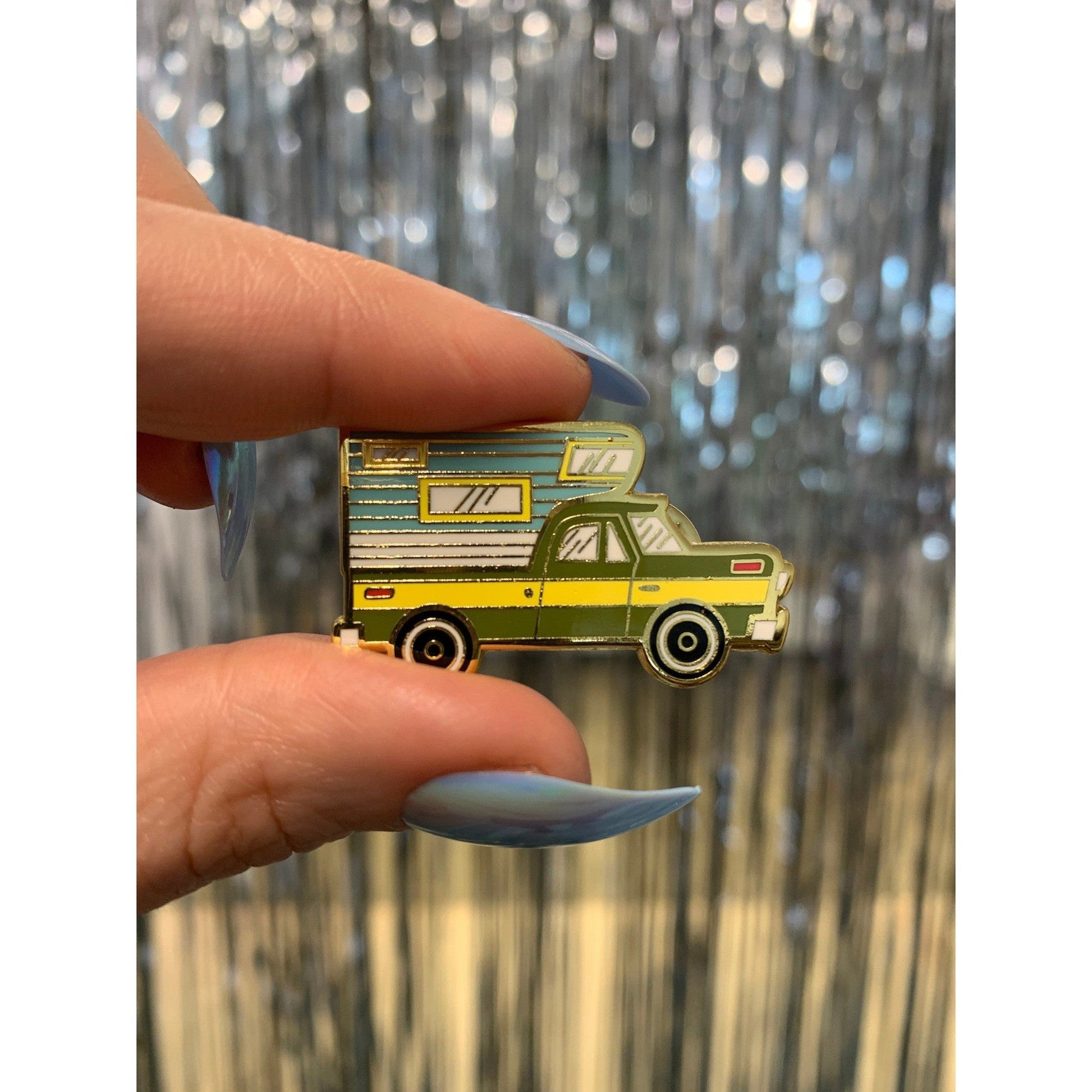A high-quality hard enamel pin lending a truck with a camper bed design and butterfly clip closure. Comes packaged on a double-sided, thoughtfully-coordinated "Life Is Better When You're Camping" card with space for a handwritten note on the back.