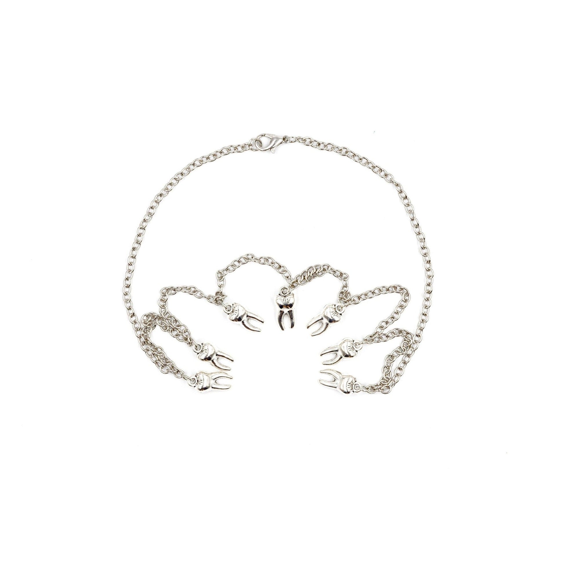 Seven man-repelling tooth charms decorate this 19-inch silver chain ending in a lobster clasp.