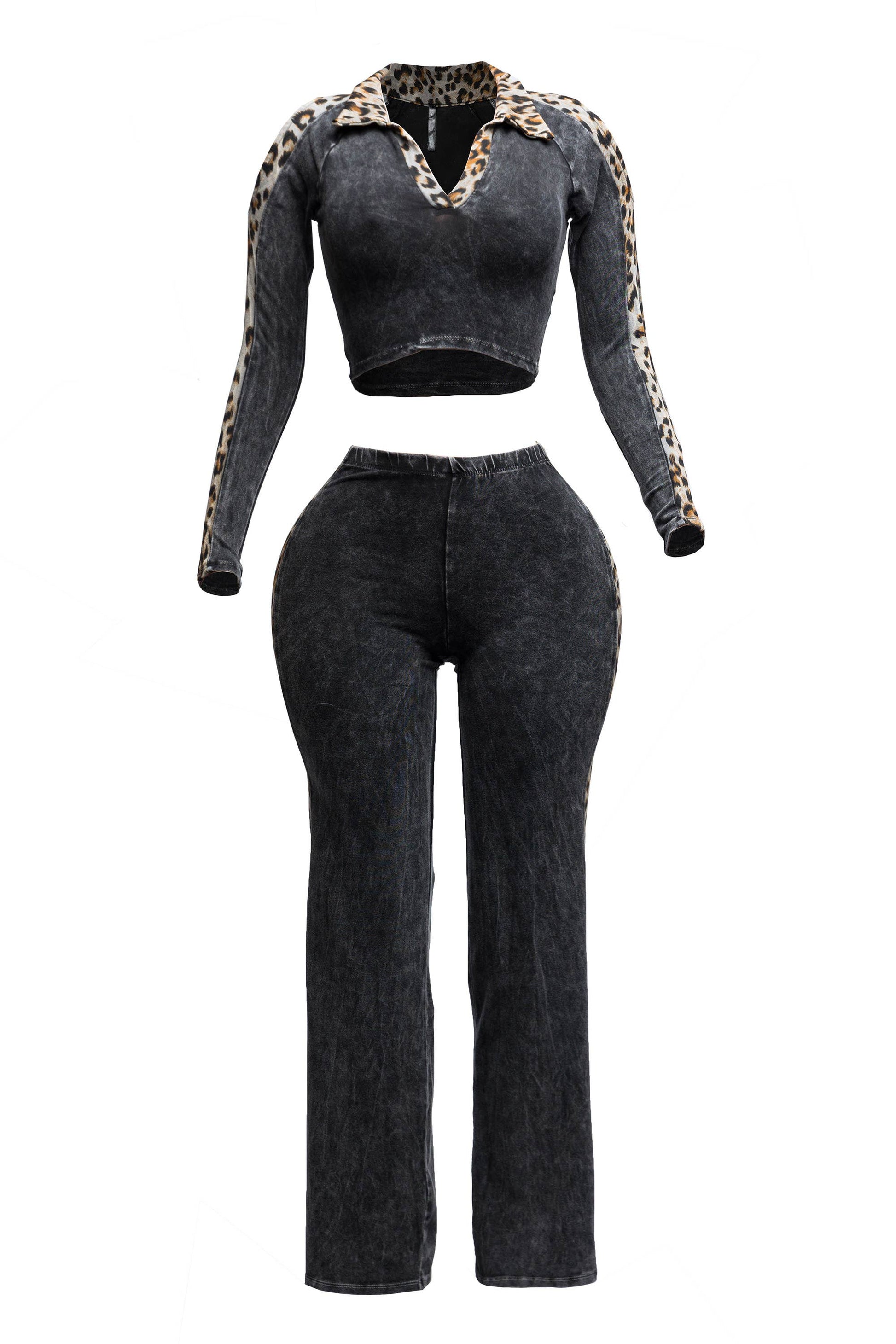 Maya Leopard Detail Curvy Plus Size Mineral washed Crop Top & Pants set