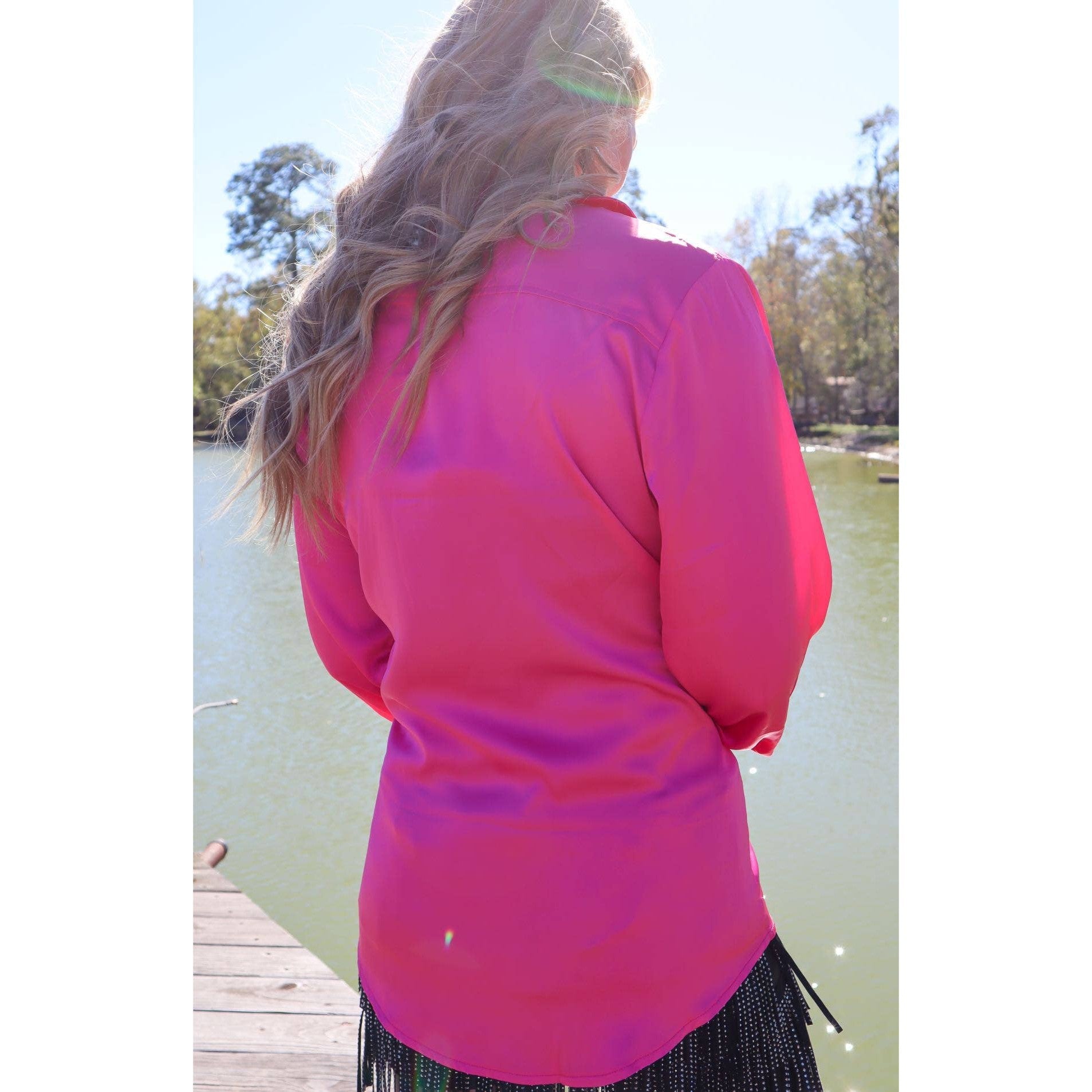 The Dolly Duo is gorgeous, feminine, and flashy. This long sleeve satin button down is kicked up a notch or five with rhinestone embellished double button cuffs, front pocket, and pearl buttons.