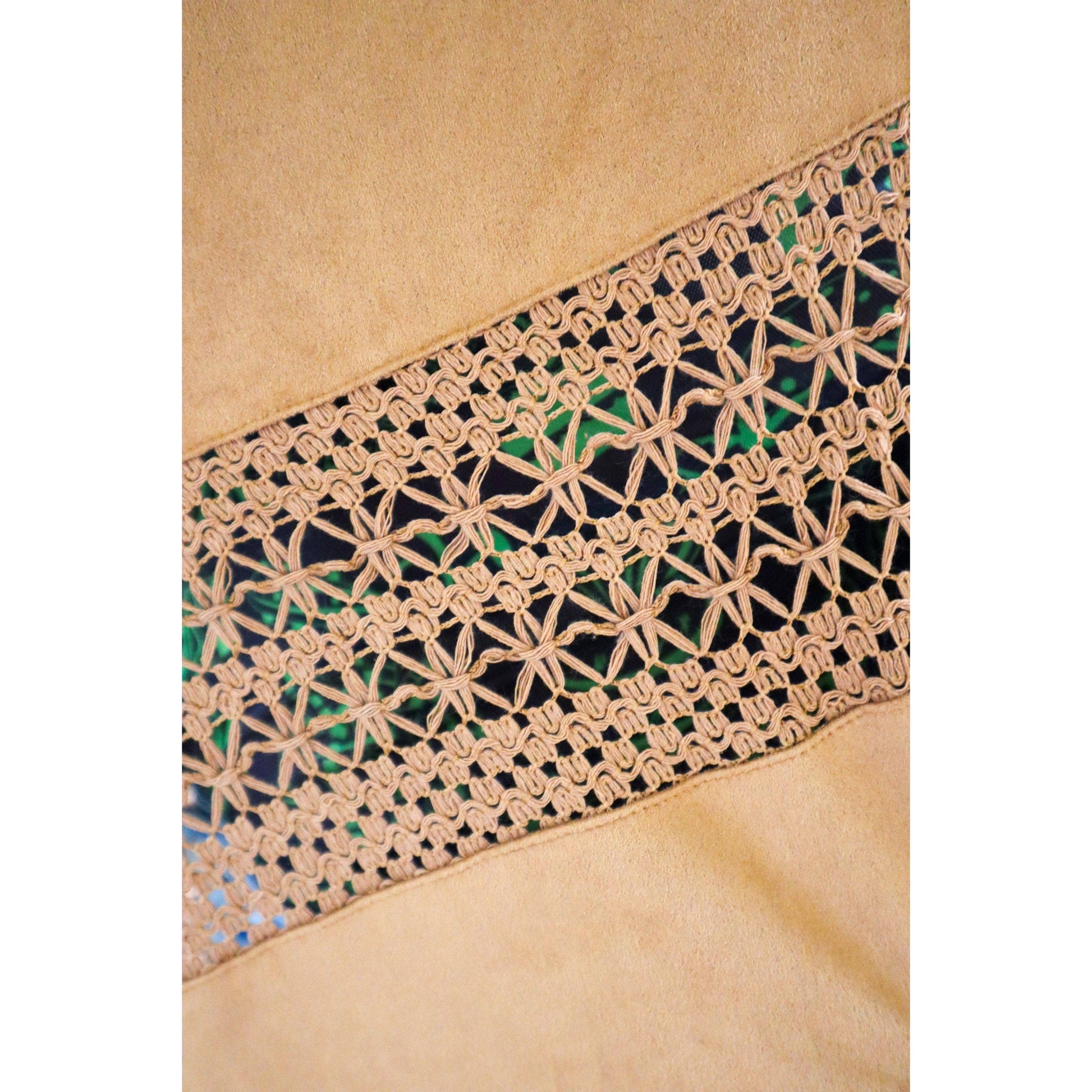 - Features: Vegan suede fabric, crochet accents, fringed bottom hem