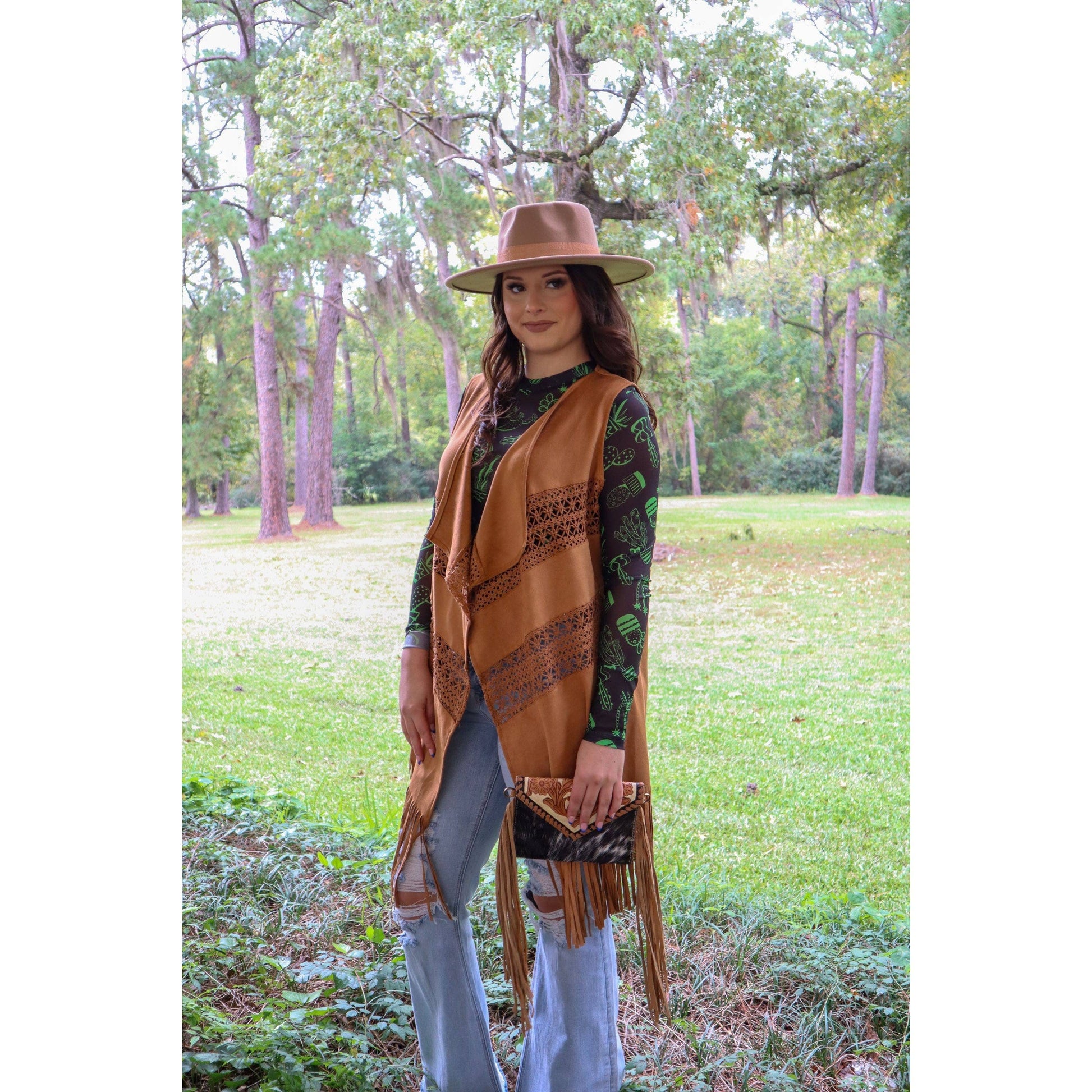 [Size S/M Remaining] Cowgirl Vegan Suede Crochet Duster in Brown | Open-front Coat Outerwear
