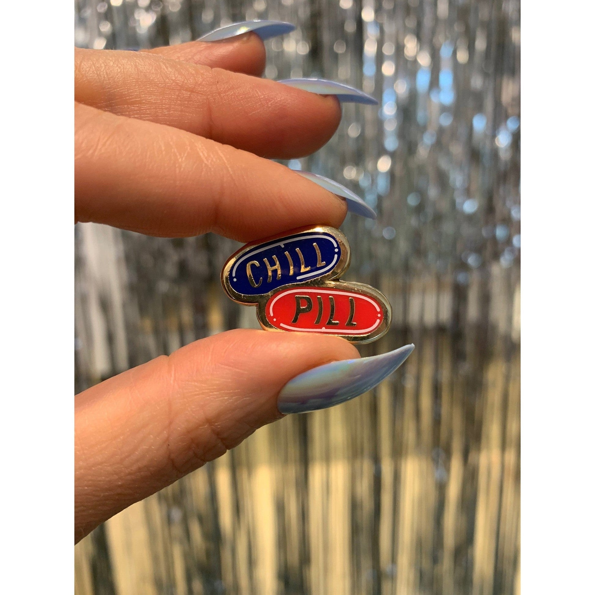 A high-quality hard enamel "Chill Pill" pin with butterfly clip closures. Comes packaged on a double-sided, thoughtfully-coordinated "Take A Chill Pill" card with an intentional blank space on the reverse side for a handwritten note for gifting.