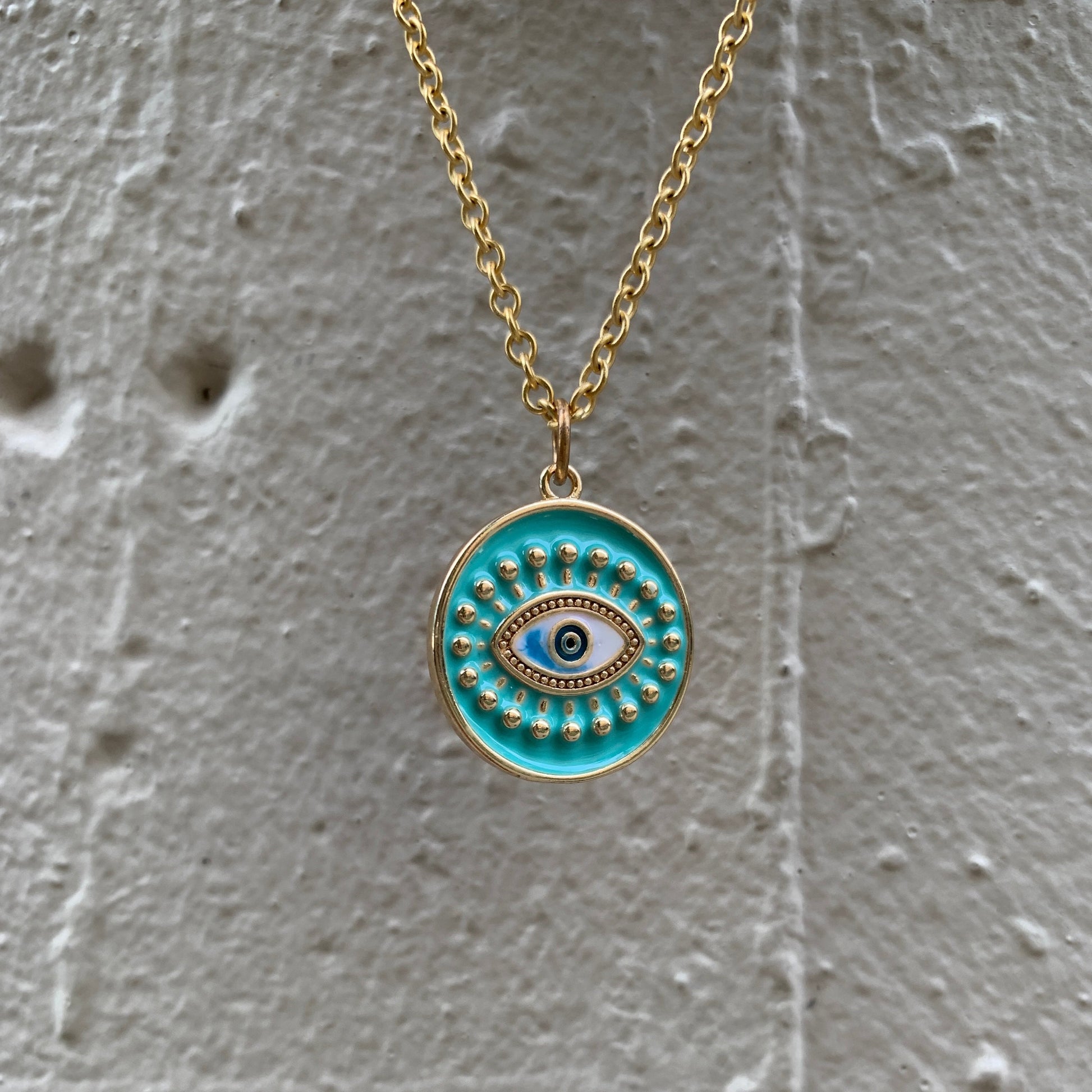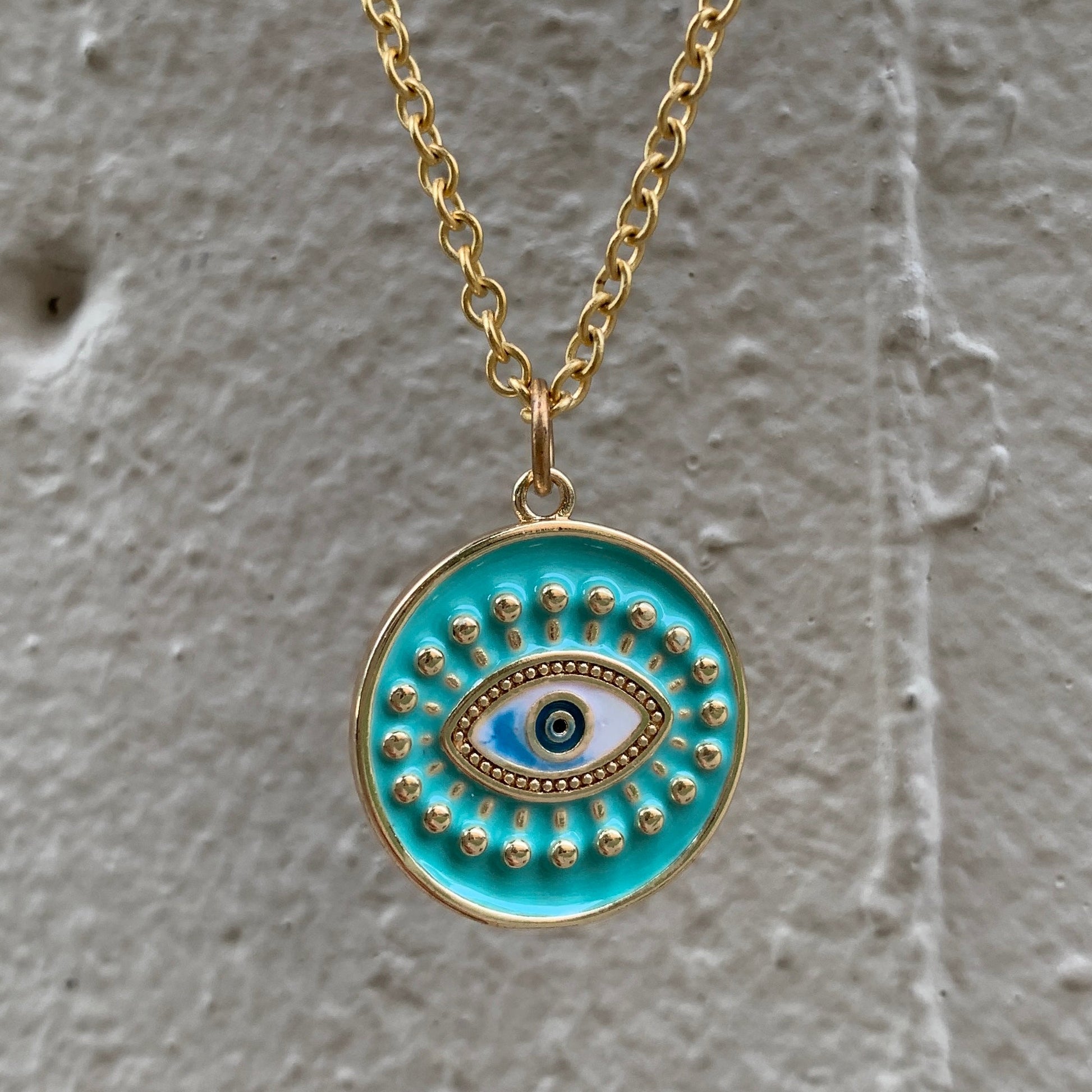 Turquoise enamel brass eye pendant keeps a close watch on things.