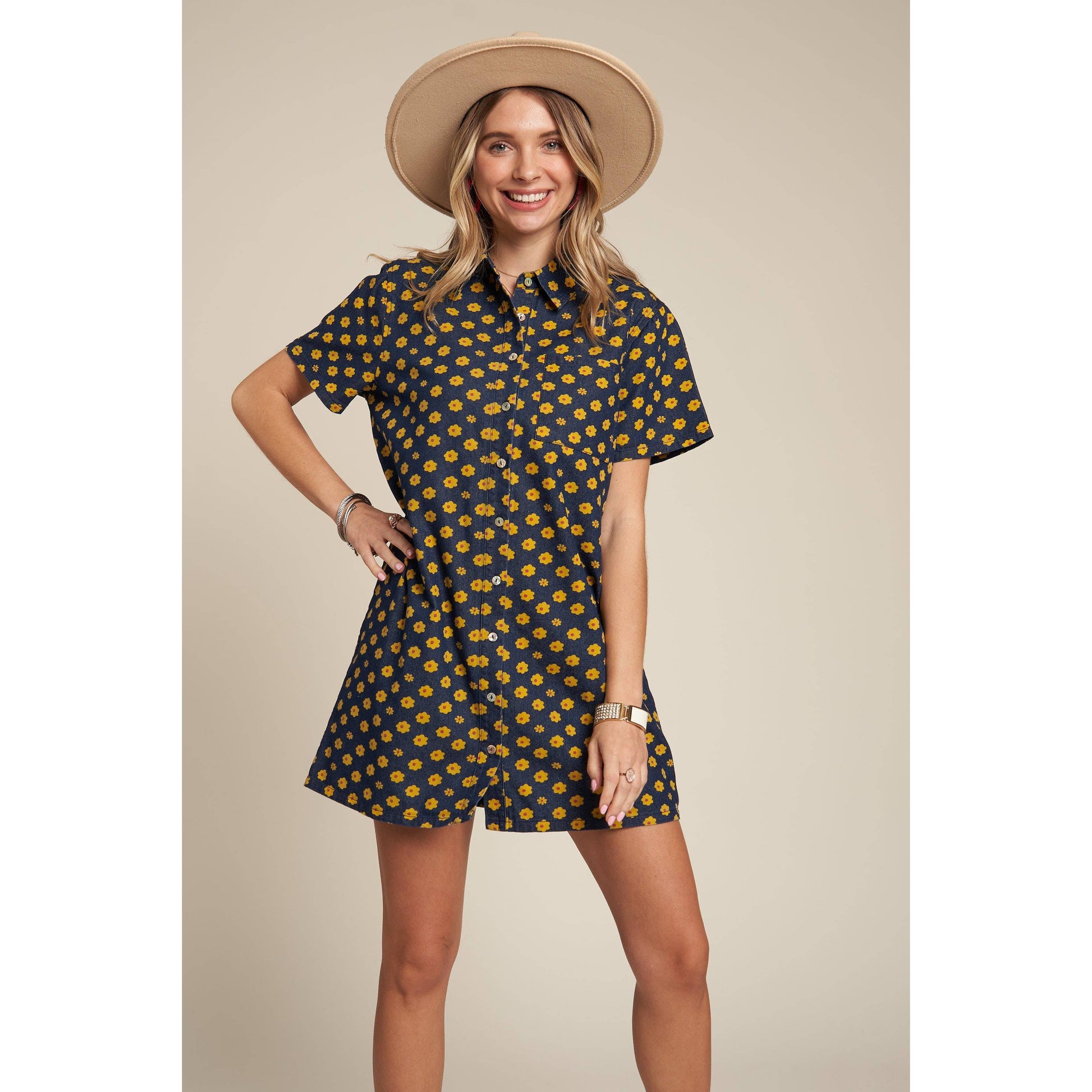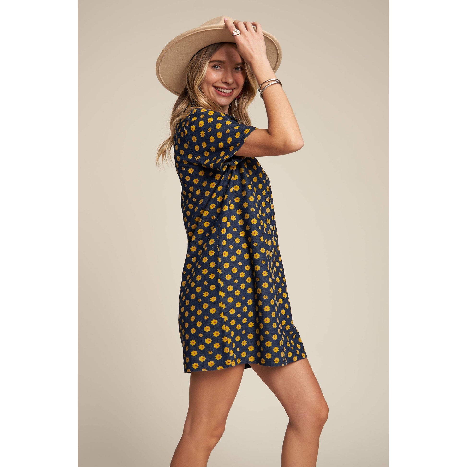 Yellow Flowers Button Down Denim Shirt Dress | Fashion Mini Dress [Available in SM,M]