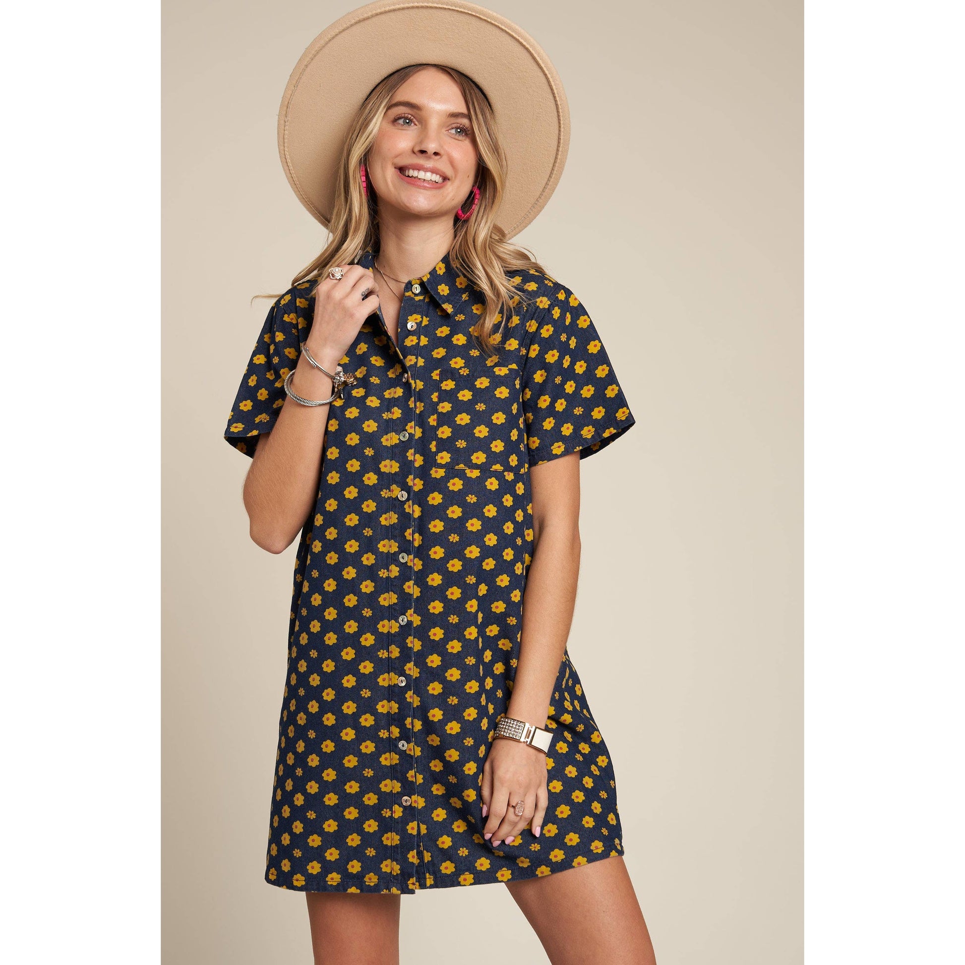 This Button Down Floral Denim Shirt Dress is perfect for the fashion-forward trendsetter!