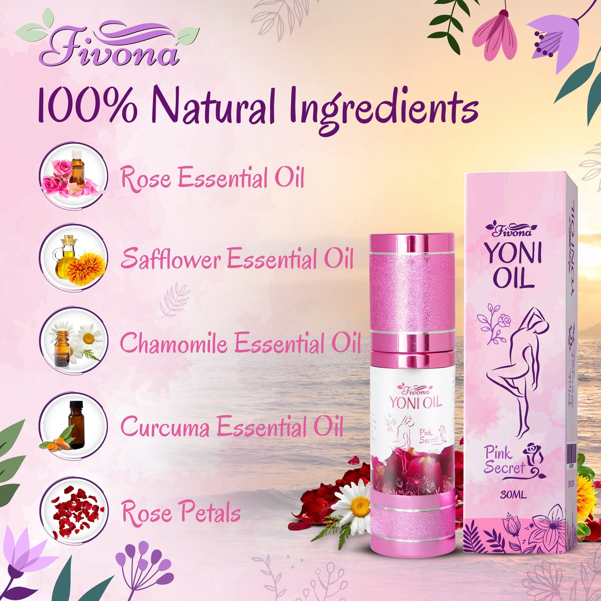 Fivona Yoni Oil Pink Secret for Soothing Feminine Care - Pleasure Blend of Essential Oils - Moisturizing Oil Blend for Odor Control, Detox and PH Balance 30ml