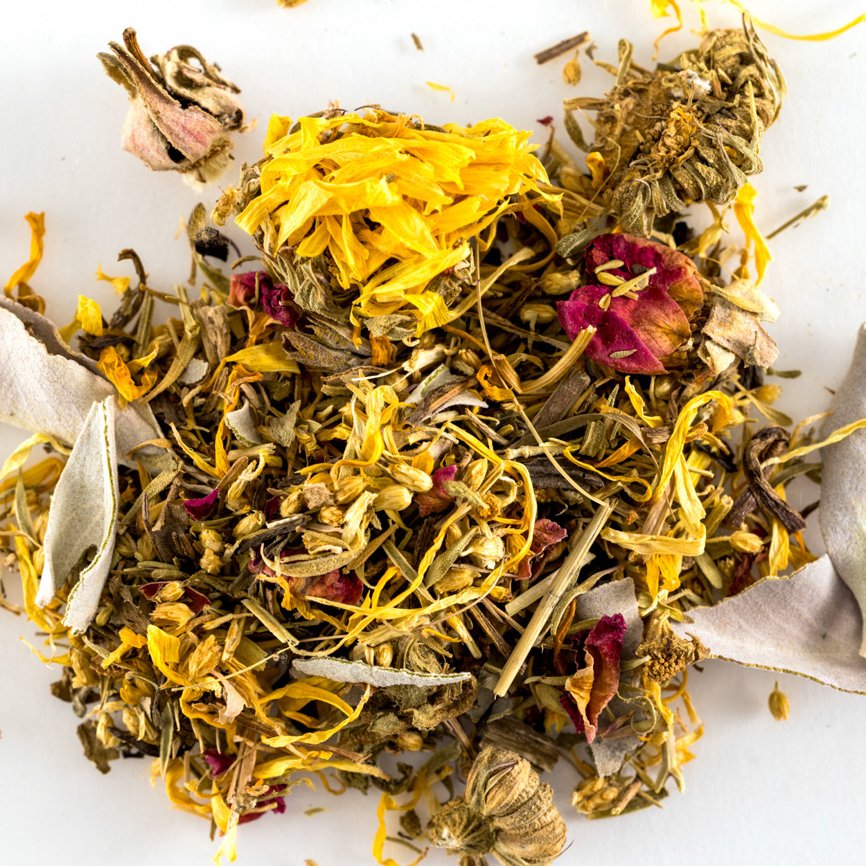 Ingredients: A blend of organic White Sage Leaf, Rose Petals, Thyme Leaf, Yarrow Leaf, Plantain Leaf, and Calendula Flowers.