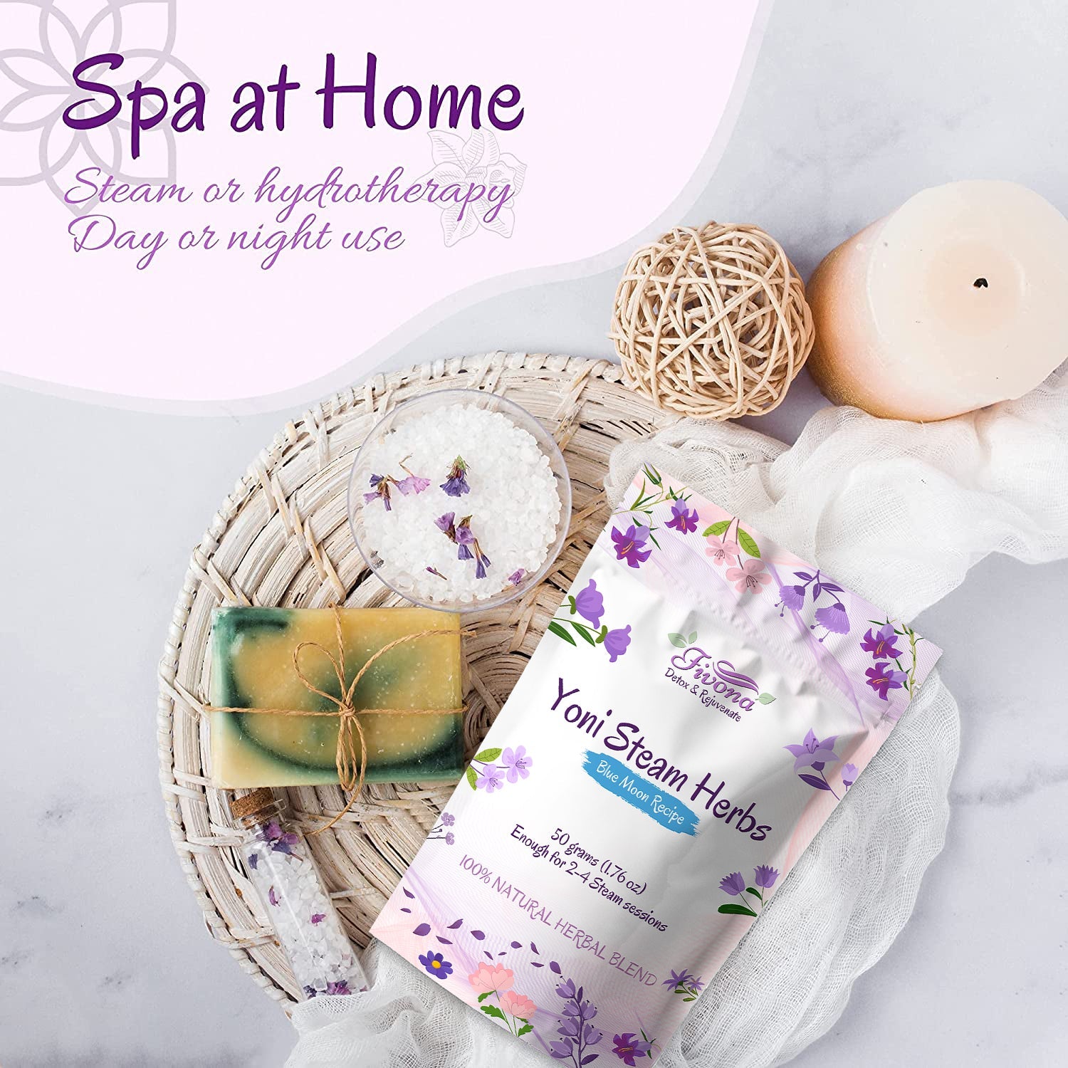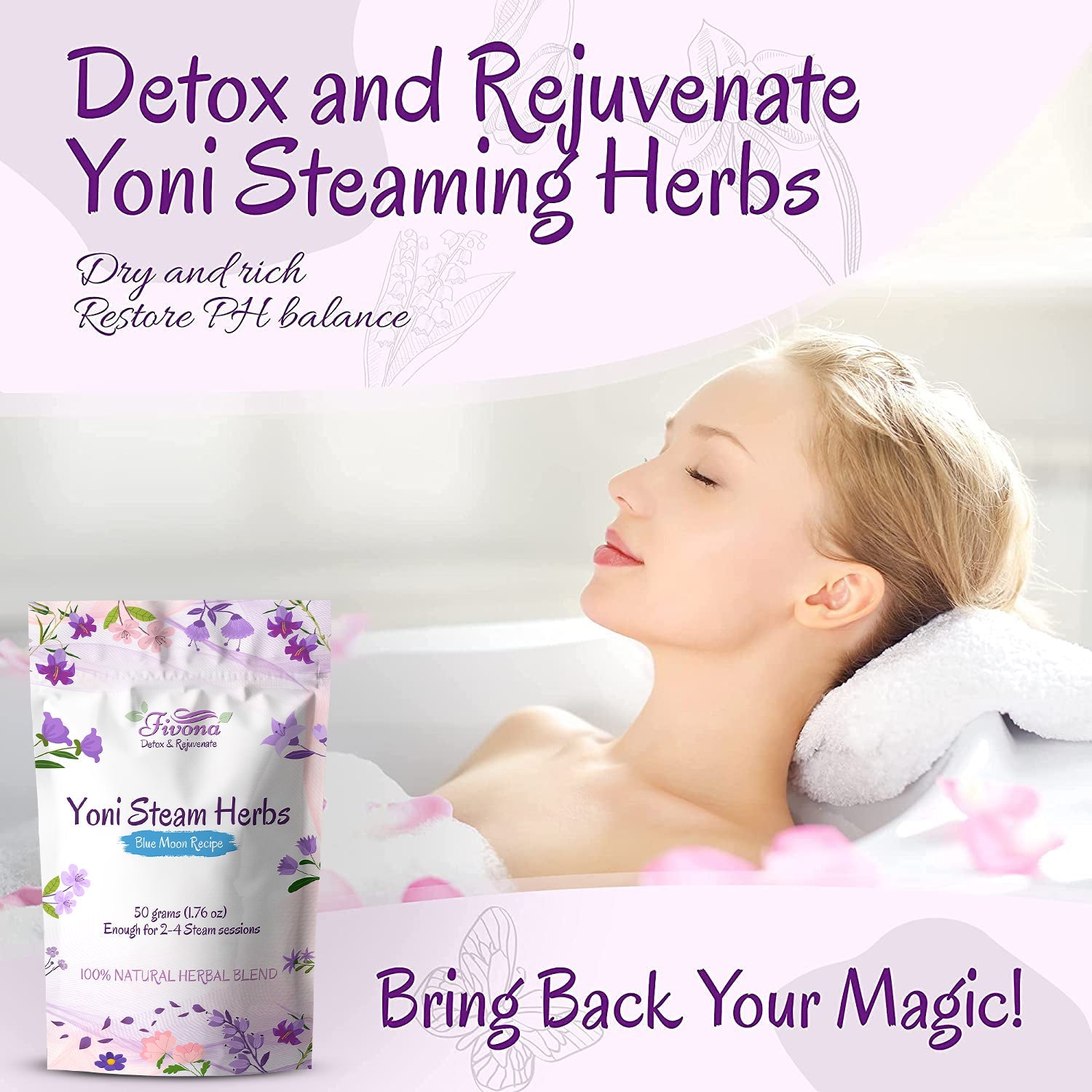 Fivona's steaming herbs help to aid in the relief of tension and stress, alleviate anxiety, improve sleep, manage insomnia and enhance fertility. Carefully blended blue moon recipe herbal blend can help the whole body to relax, boost feminine energy, and get relieves emotional tension.